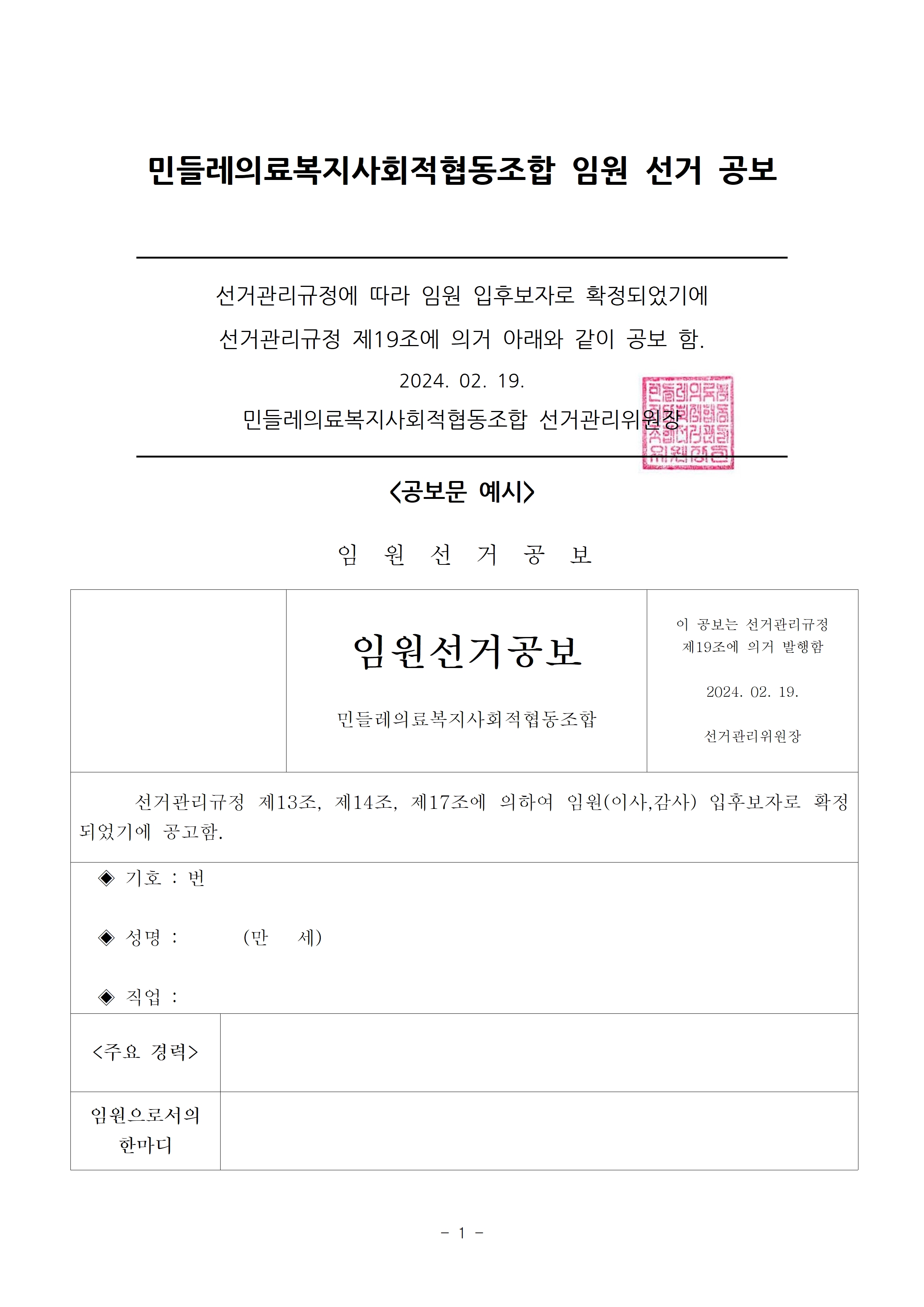2024년 임원(이사, 감사)선거 당선인 공고